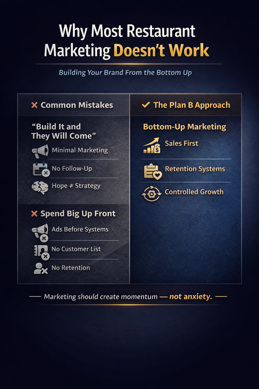 Instead of building from the top down, Plan B is a bottom-up approach to restaurant marketing — one that prioritizes sales, retention, and systems before polish.
